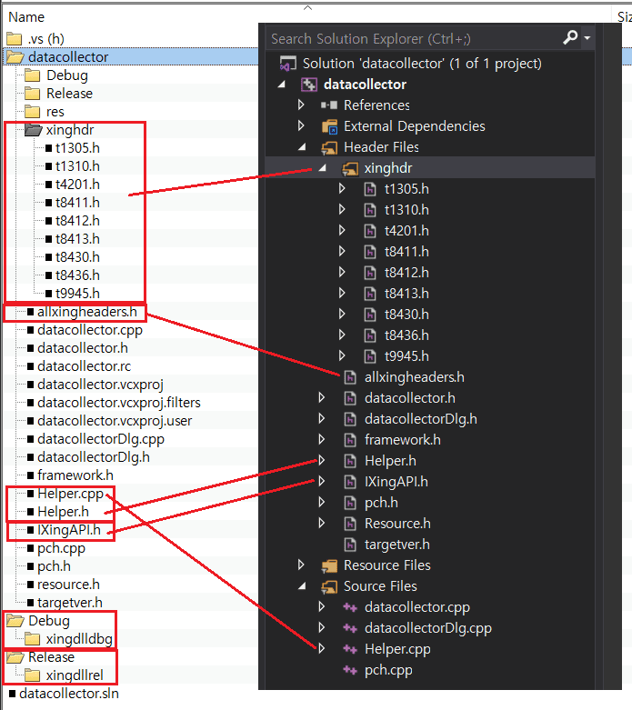 비주얼스튜디오에서 Debug 모드로 빌드하면 Debug 버전 DLL, Release 모드로 빌드하면 Release 버전 DLL이 링크될 수 있도록 합니다. 아래와 같이 프로젝트의 Debug 폴더에 "xingdlldbg" 폴더 생성 후 Debug 버전 DLL 파일들을 복사, Release 폴더에 "xingdllrel" 폴더 생성 후 Release 버전 DLL 파일들을 복사합니다.