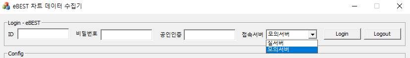 프로그램 실행 시 Combobox에서 실서버, 모의서버를 선택할 수 있습니다.