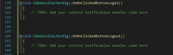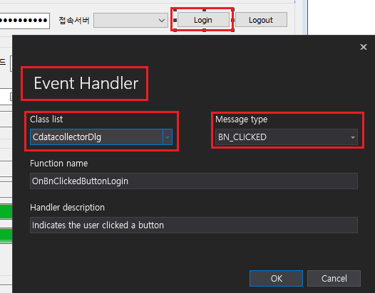 Login, Logout 버튼에 BN_CLICKED 이벤트핸들러를 등록해 줍니다.