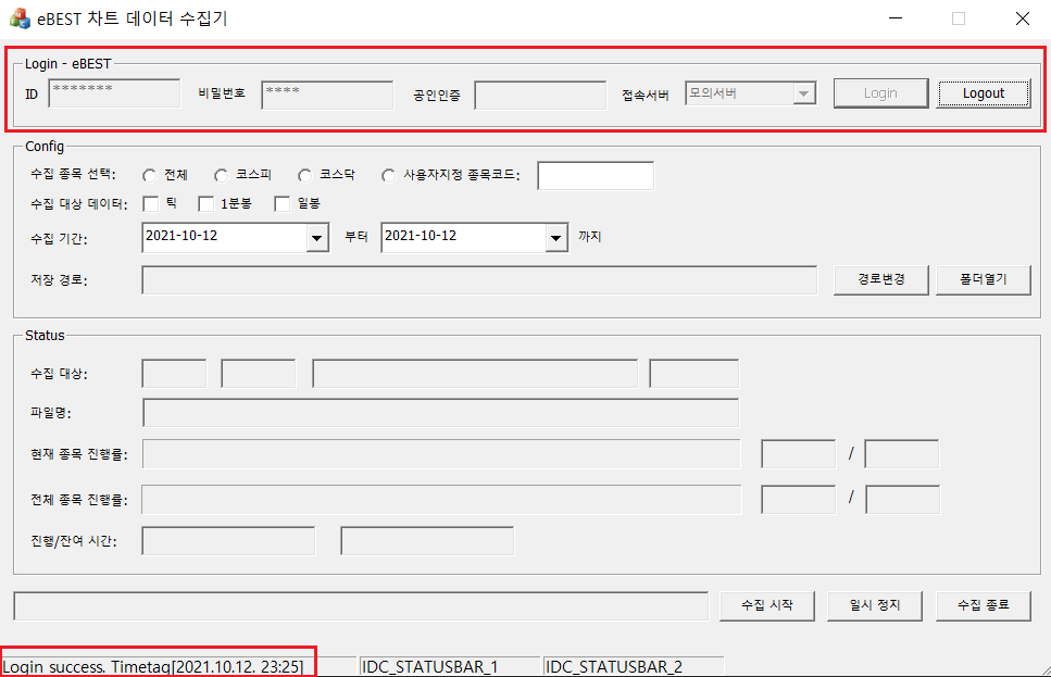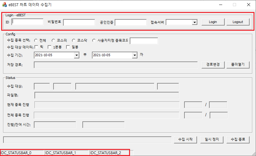로그인에 필요한 아이디, 비밀번호, 공인인증번호, 접속서버(실서버, 모의서버) 정보를 입력받아 로그인을 하거나 로그아웃을 할 수 있는 인터페이스입니다.