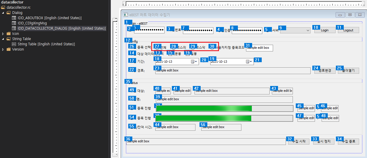 수집 종목 선택에 라디오 버튼을 사용했는데 라디오 버튼을 그룹으로 묶으려면 탭 순서를 연속된 번호로 지정해 주어야 합니다. 리소스 뷰어에서 메인 대화창을 열고 ctrl+D 버튼을 누르면 아래와 같이 탭 순서가 표기됩니다. 아래 그림에서는 연속된 번호로 지정된 것을 확인할 수 있습니다. 연속 번호로 지정되어 있지 않으면 마우스를 순서대로 클릭하여 다시 연속된 순번의 탭 번호를 가질 수 있도록 해줍니다.