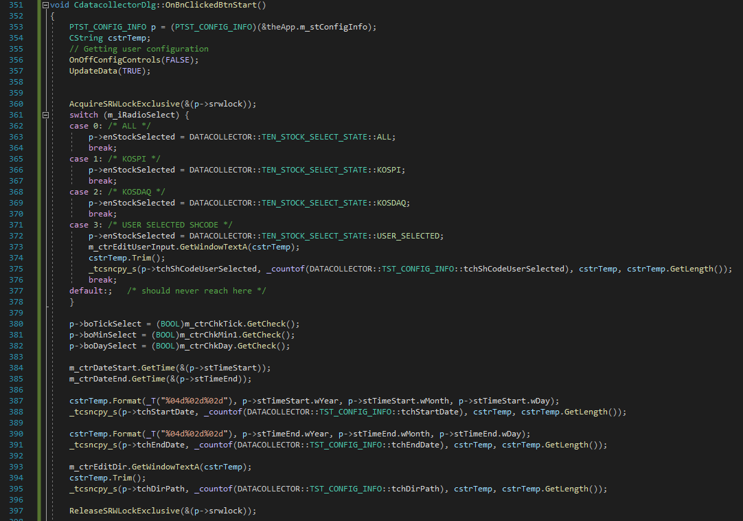 여기까지 데이터 수집에 필요한 설정 사항 모두가 TST_CONFIG_INFO 구조체 변수에 저장되도록 마무리되었습니다.