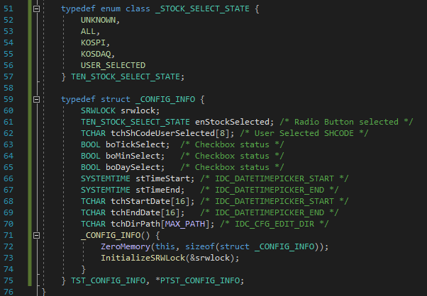 설정 내용 관리를 위한 구조체를 아래와 같이 정의하였습니다. "수집시작" 버튼을 누를 때 설정창 컨트롤의 내용을 아래 구조체에 저장합니다.