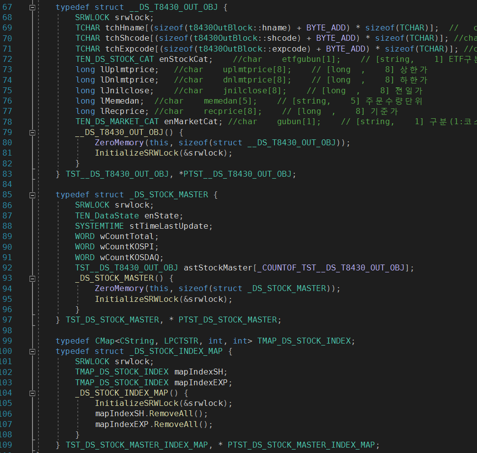 "t8430.h"헤더파일의 t8430OutBlock을 그대로 TST__DS_T8430_OUT_OBJ로 정의하였습니다.