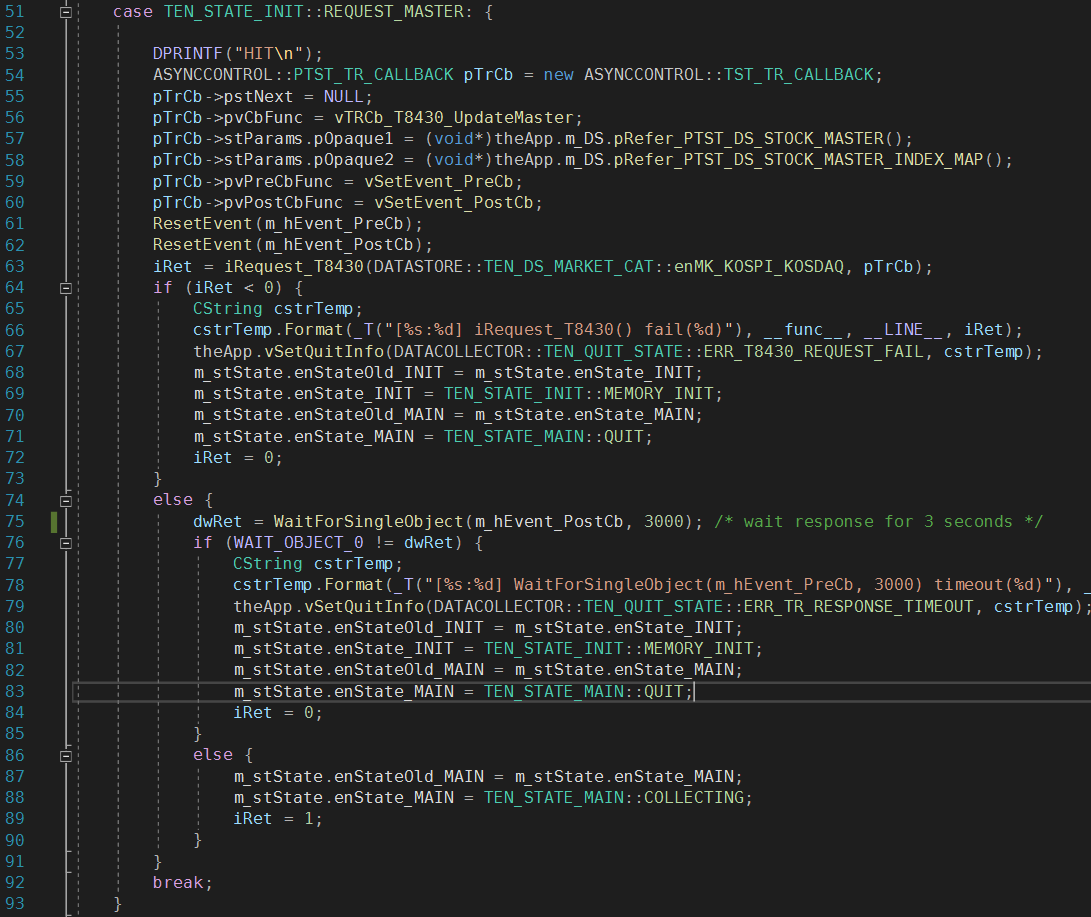 TR을 Request 함수를 호출하면 Request 함수는 Request ID를 반환하고 종료됩니다. 서버 응답은 일정시간 경과 후 해당하는 MSG_ID를 통해 Callback 함수의 파라미터로 넘어옵니다. Request와 Response가 sync가 아닌 async로 처리되고 있기 때문에 아래와 같이 관련 자료구조를 정의하였습니다. 위 CDataStore의 TST_DS_STOCK_MASTER의 TEN_DataState는 데이터가 요청 중인지, 저장완료상태인지, 비어있는지 등을 나타냅니다. 이 변수를 활용하면 굳이 비동기처리를 하지 않아도 Polling 방식으로 해당 메모리를 주기적으로 감시하며 데이터 수신여부를 알 수 있기도 합니다. Polling 방식과 Callback Interrupt 방식 중 어떤 방식으로 응답을 확인할 것인지는 해당 TR을 Request 하는 Caller의 선택입니다. Callback Function Pointer를 설정하지 않으면 Caller가 Polling을 하고 있으면 되고, 아니라면 Callback Function이 호출될 때까지 대기하고 있으면 됩니다.