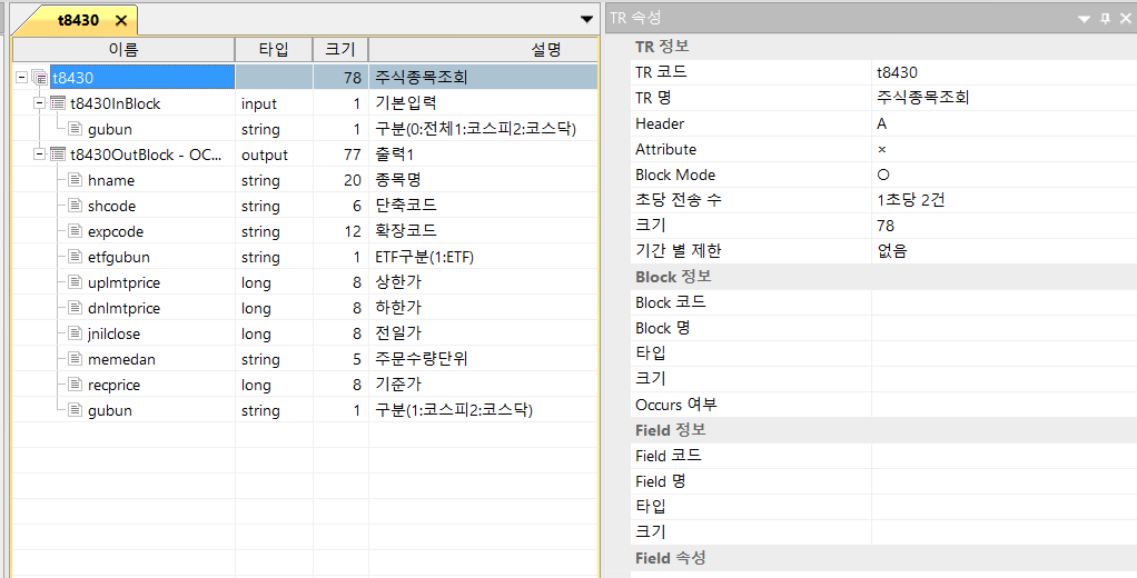 Block Mode이면 이 OutBlock이 메모리공간에 연속적으로 할당되어 하나의 Block으로 응답이 오니까 수신 패킷의 Data사이즈를 sizeof(t8430OutBlock)으로 나누면 몇 개의 종목정보를 수신했는지 알 수 있습니다.