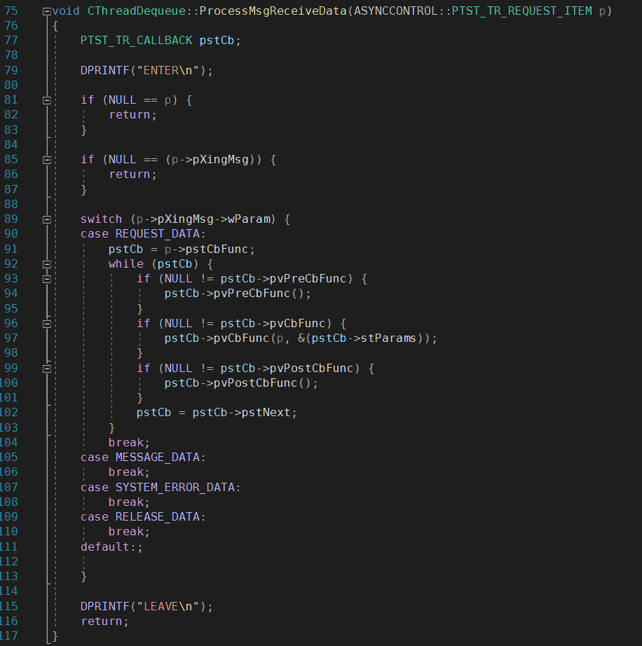 그럼 이 수신데이터가 어떤 Request의 응답인지 알아야겠죠. LPARAM이 RECEVE_PACKET구조체 타입이기 때문에 RECEVE_PACKET::nRqID값을 통해 Request ID를 알 수 있고 이 Request ID에 해당하는 Request ITEM은 CAsyncControl의 TR_REQUEST_STATUS ARRAY에 저장해 뒀으므로 거기서 REQUEST ITEM을 꺼낸 뒤 수신한 WPARAM과 LPARAM을 REQUEST_ITEM::pXingMsg에 붙여서 Queue에 PUSH 하면 됩니다. Push 후에 SetEvent(m_hEvent_Wakeup_ThreadDequeue) 호출을 하면 Dequeue 스레드가 깨어나 Queue에 뭐가 들어왔나 확인 후 처리함수를 호출하게 됩니다.