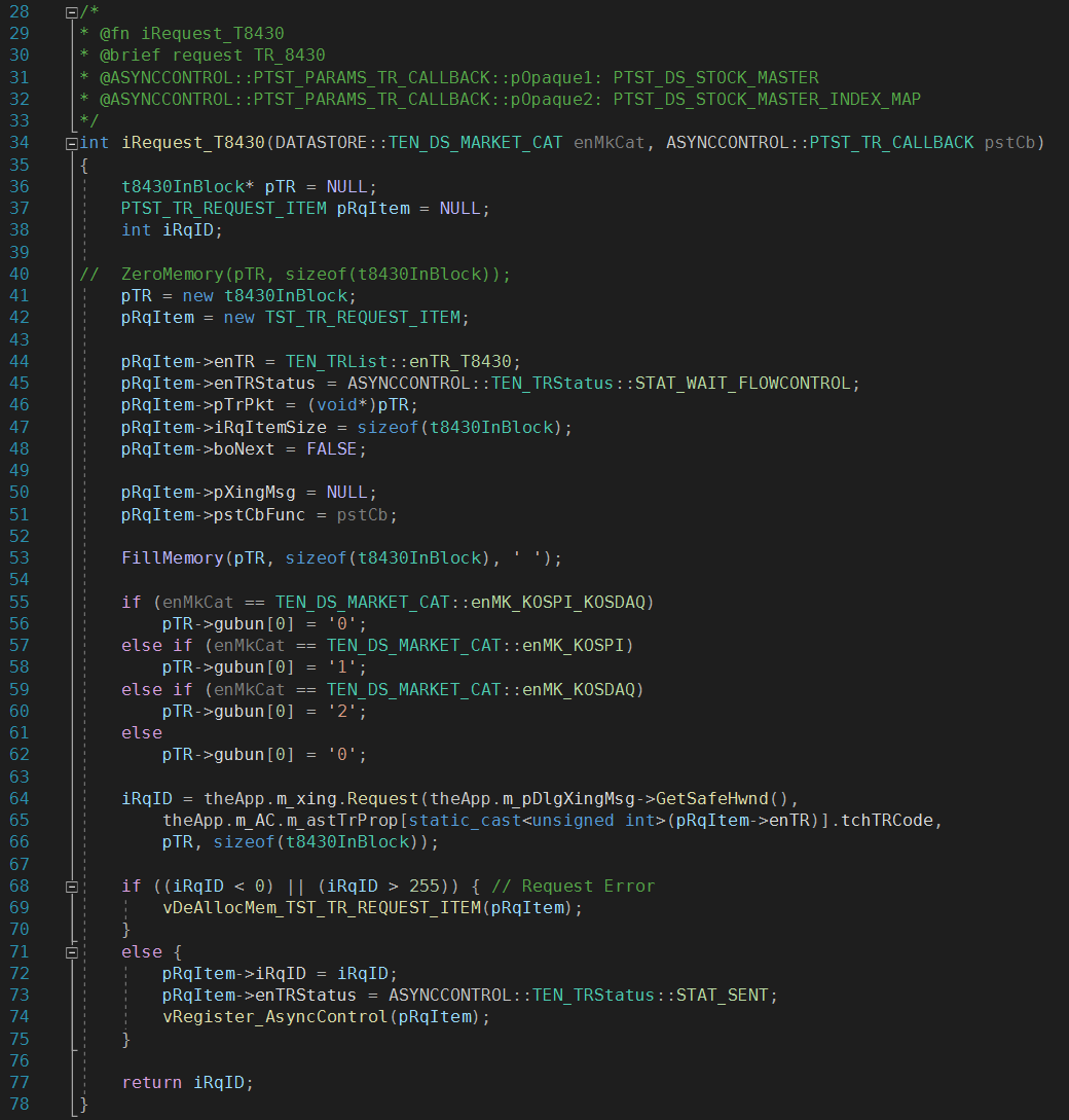 CTreadLooper의 MainState가 REQUEST_MASTER 면 t8430 TR 조회를 합니다. 이를 위해 int iRequest_T8430(DATASTORE::TEN_DS_MARKET_CAT enMkCat, ASYNCCONTROL::PTST_TR_CALLBACK pstCb)이라는 별도의 Helper Function을 작성하였는데 첫 번째 파라미터로 코스피, 코스닥 구분값을 넣고 두 번째 파라미터로 콜백구조체 포인터를 넘겨줍니다. TST_TR_CALLBACK의 pvCbFunc는 수신데이터를 처리할 함수포인터, pvPreCbFunc는 수신데이터처리 함수 호출 전 호출하는 함수포인터, pvPostCBFunc는 수신데이터 처리 함수 호출 후 호출하는 함수포인터입니다. pvPreCbFunc와 pvPostCbFunc를 통해 비동기 처리를 원활하게 할 수 있습니다. stParams의 Opaque 변수에는 Caller와 Callee(수신데이터 처리 함수) 간 약속한 필요한 값을 넘겨주면 됩니다.
