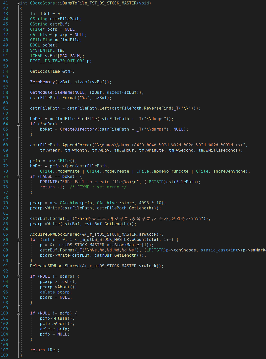 메모리 데이터를 파일로 저장하는 덤프함수를 아래와 같이 작성하여, t8430 수신 완료 후 호출해 보았습니다.