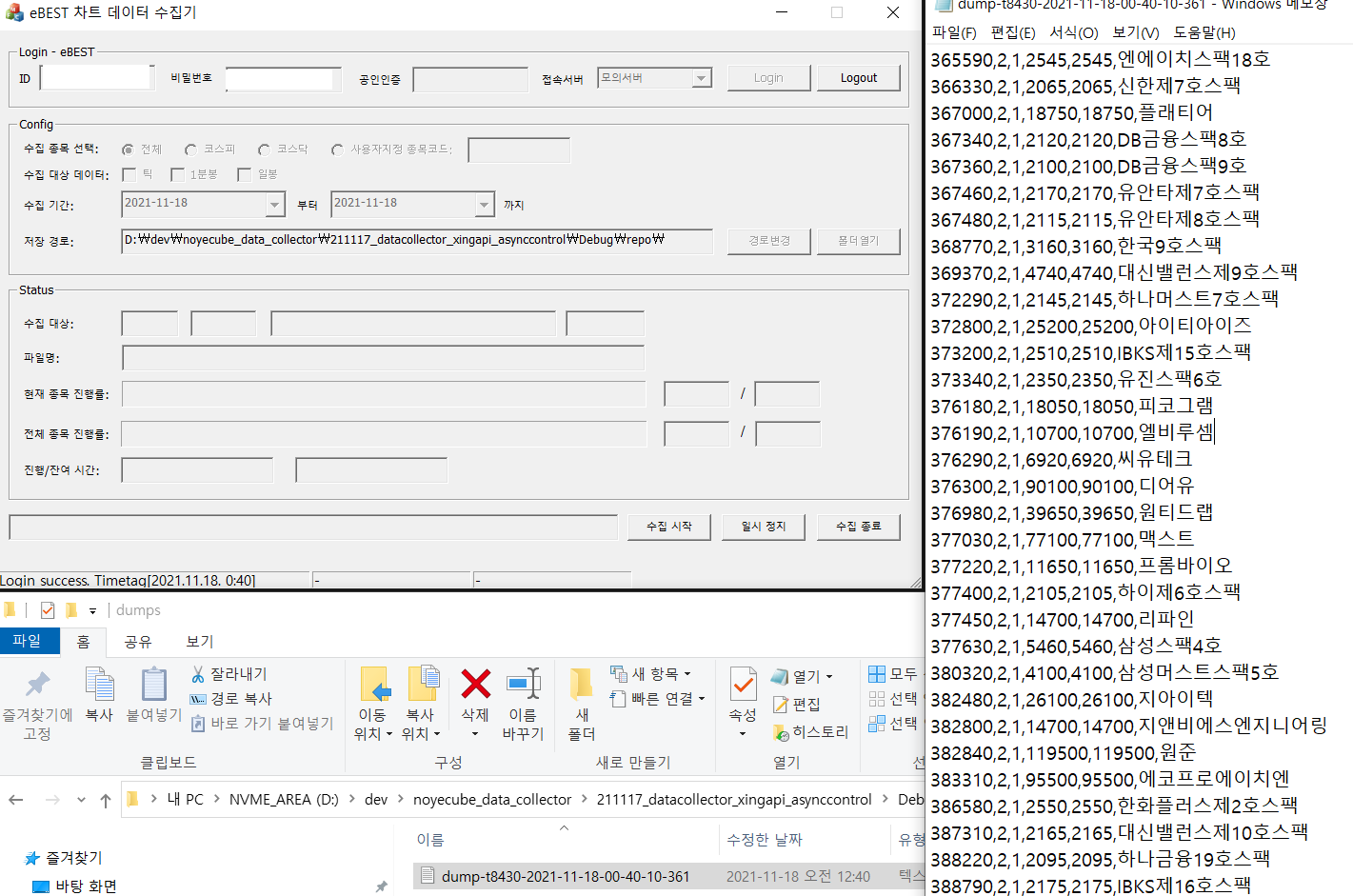 로그인 완료 후 "수집 시작"을 누르니 디스크에 덤프파일이 생겼네요. t8430 주식마스터조회 성공입니다.