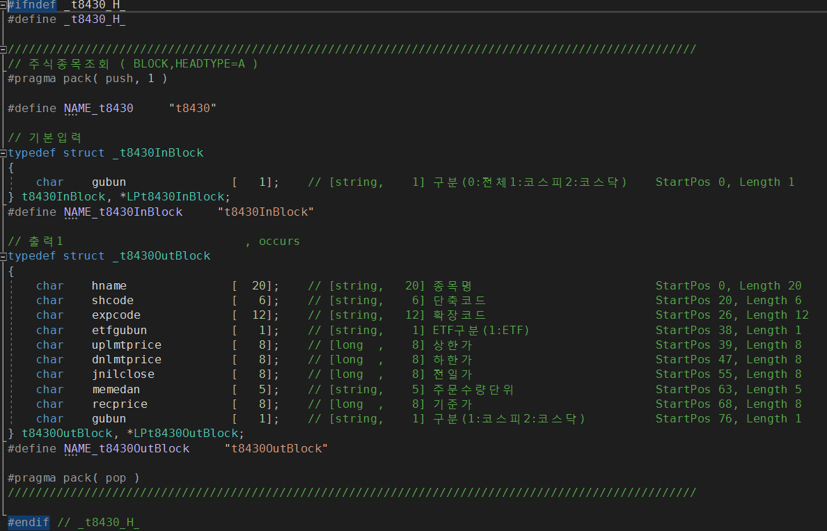 아래는 실제 API 호출에 필요한 헤더파일 t8430.h의 내용입니다.